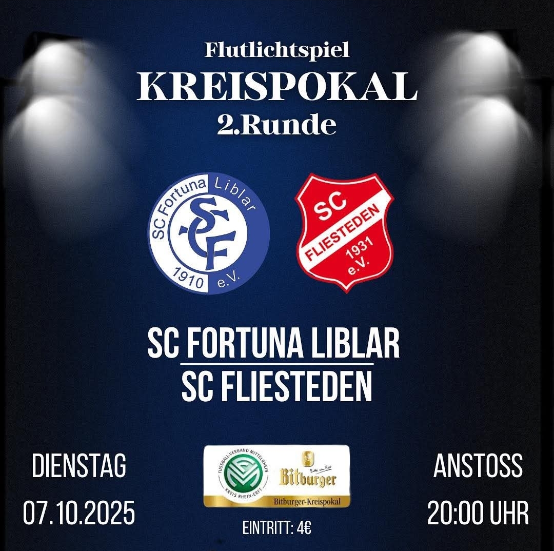 In der 2. Runde des diesjährigen Kreispokals wartet ein absolutes Highlightspiel auf uns. Unter Flutlicht auf der heimischen Kampfasche geht es am Dienstag, den 07.10.2026 gegen den Landesligaaufsteiger SC Fliesteden 1931 .